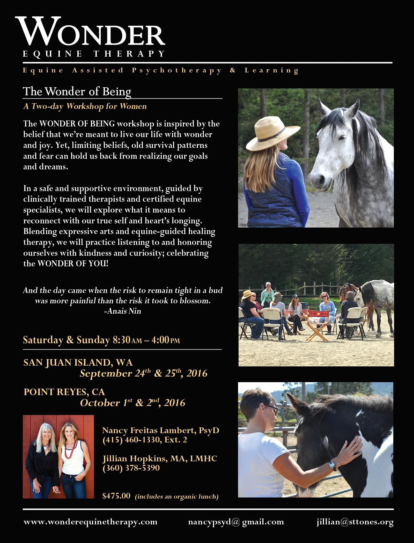 In a safe and supportive environment, guided by clinically trained therapists and certified equine specialists, we will explore what it means to reconnect with our true self and heart's longing. Blending expressive arts and equine-guided healing therapy, we will practice listening to and honoring ourselves with kindness and curiosity; celebrating the WONDER OF YOU!